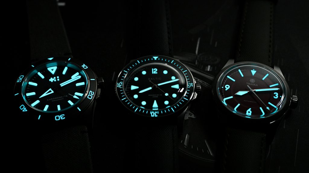 In direct comparison, the lumicast indices of the Baltic hold their own against the Globolight XP hands and indices on my Christopher Ward Lumiere and the Traska Summiteer 38.