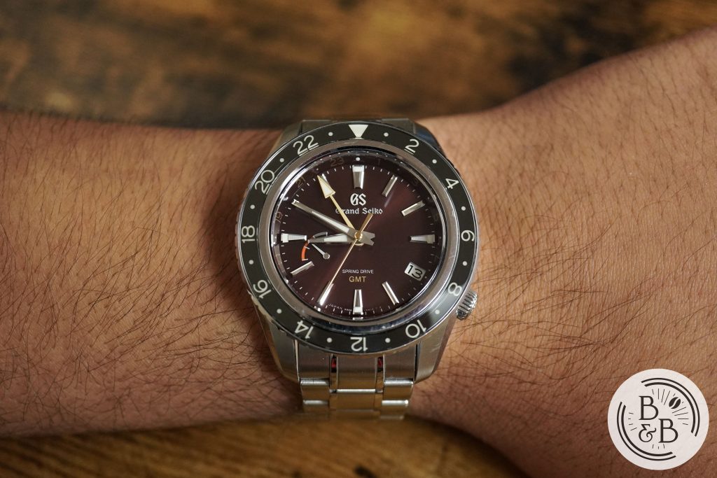 This watch uses the 9R66 Spring Drive GMT movement. This is an automatic movement with a 24-hour GMT hand and a quick-set hour hand. I think this movement really shows off the beautiful gliding seconds hand with it’s accentuated gold finish against the burgundy dial. I never get tired of looking at Spring Drive movements work their magic.