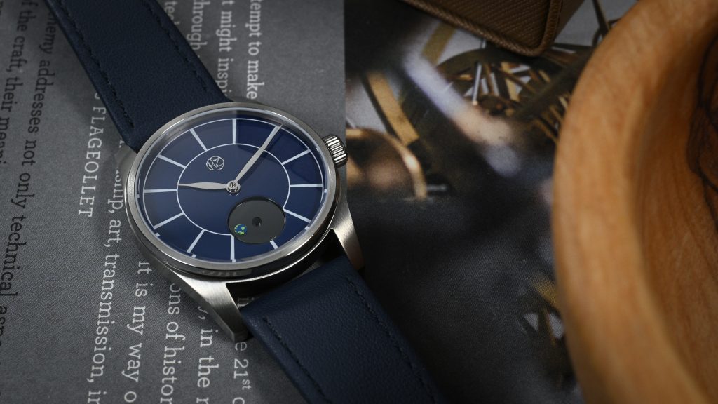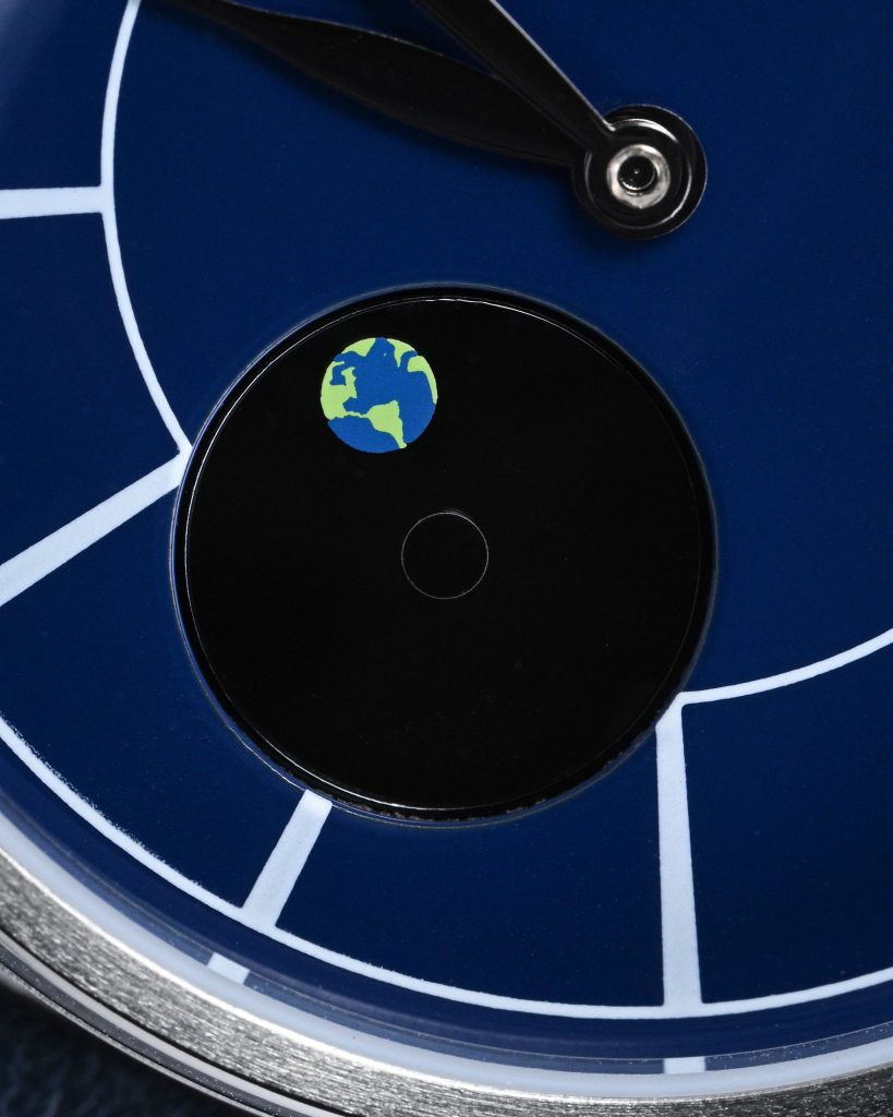 That sub-dial is particularly charming: a transparent disc rotates once per minute over a black base, carrying a tiny printed Earth that catches light in a way that feels more refined than the watch’s price would suggest.