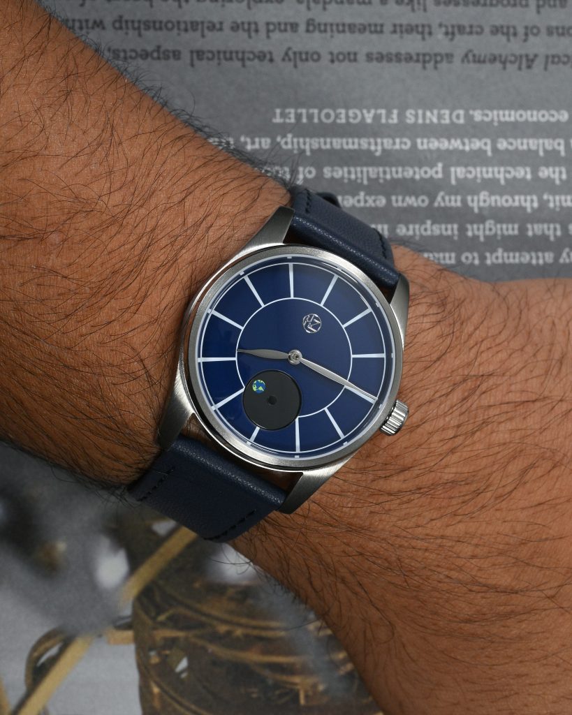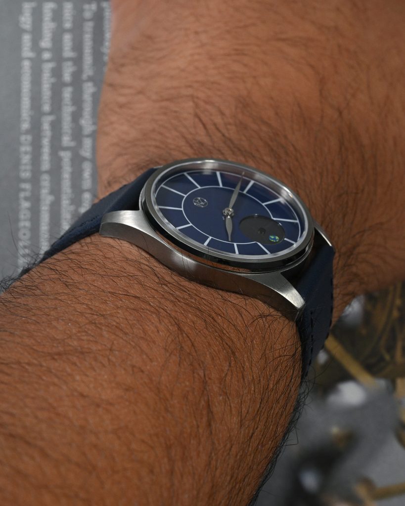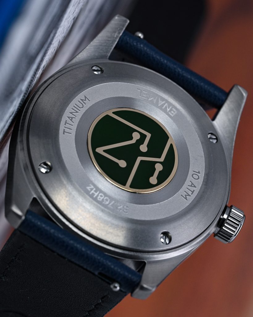 A 5.3mm push-pull crown at three o’clock, embossed with the brand’s circuit-inspired logo, is easy to handle, and the closed case-back features what I think is an enameled or lacquered medallion and a reassuring 100 meters of water resistance: more than enough for daily wear, provided you swap the leather strap before heading near the water.