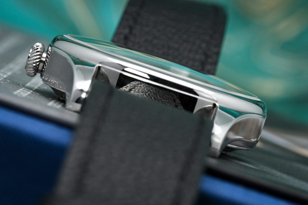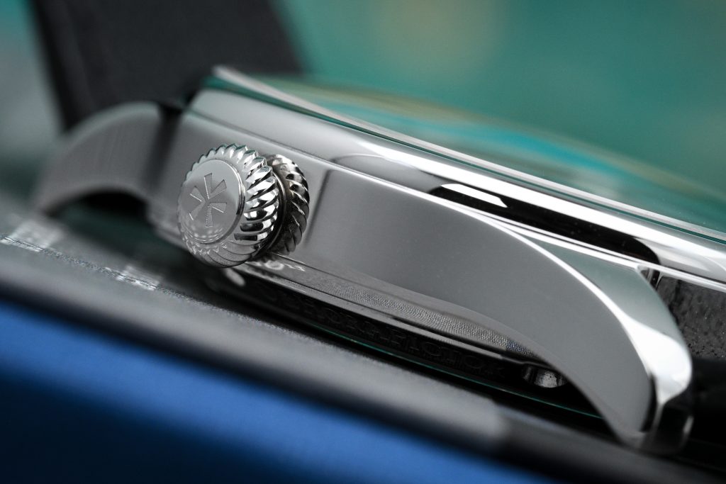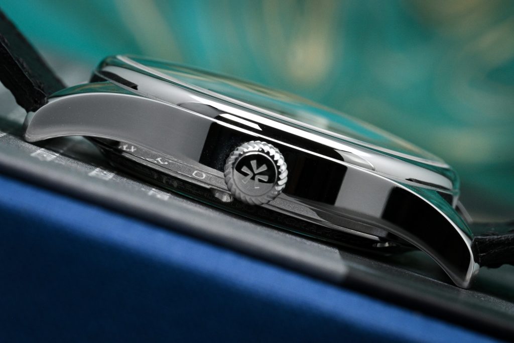 At 3 o’clock there’s a 5.5mm push-pull crown that’s signed and finished nicely. The knurling has this rounded, slightly asymmetric character that honestly reminds me a bit of F.P. Journe. In use it’s a touch slippery and soft, but is sufficiently ‘grippy’ for operation, and visually it’s a great match for the polished case.