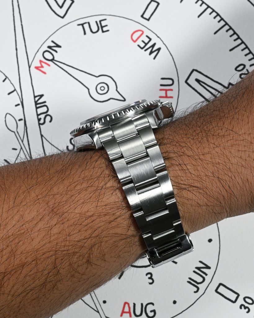 Then there’s the bezel, and yes, I’m planting my flag on aluminum over ceramic. Ceramic is “better” in the modern, practical sense: it’s harder to scratch and it stays perfect; but Rolex ceramic has a shininess that reads a little too flashy for what I want out of a sports watch. The slightly more utilitarian feel of an aluminum insert just suits this genre better, and it makes the whole watch feel like a tool first, luxury object second.