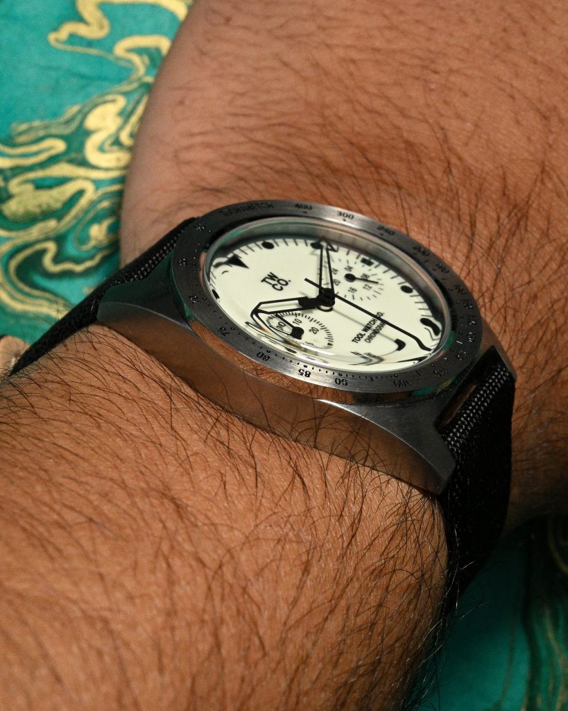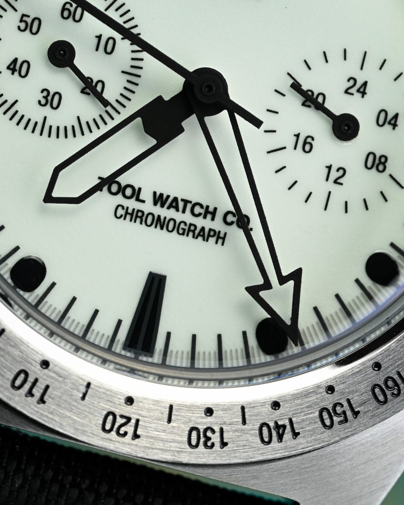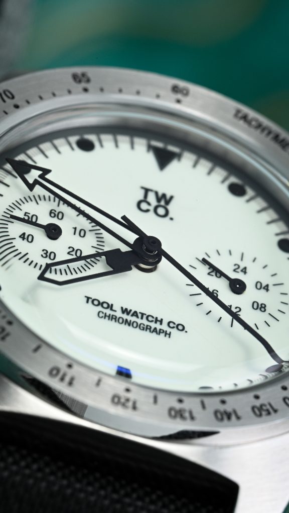 The two sub-dials are straightforward – both clearly labeled with legible markings and hands that feel appropriately sized for the registers, so they read quickly without looking like they’ve been squeezed in as an afterthought. Branding is also restrained: the Tool Watch Co. logo is printed neatly under 12, while the brand and model name sits above 6.