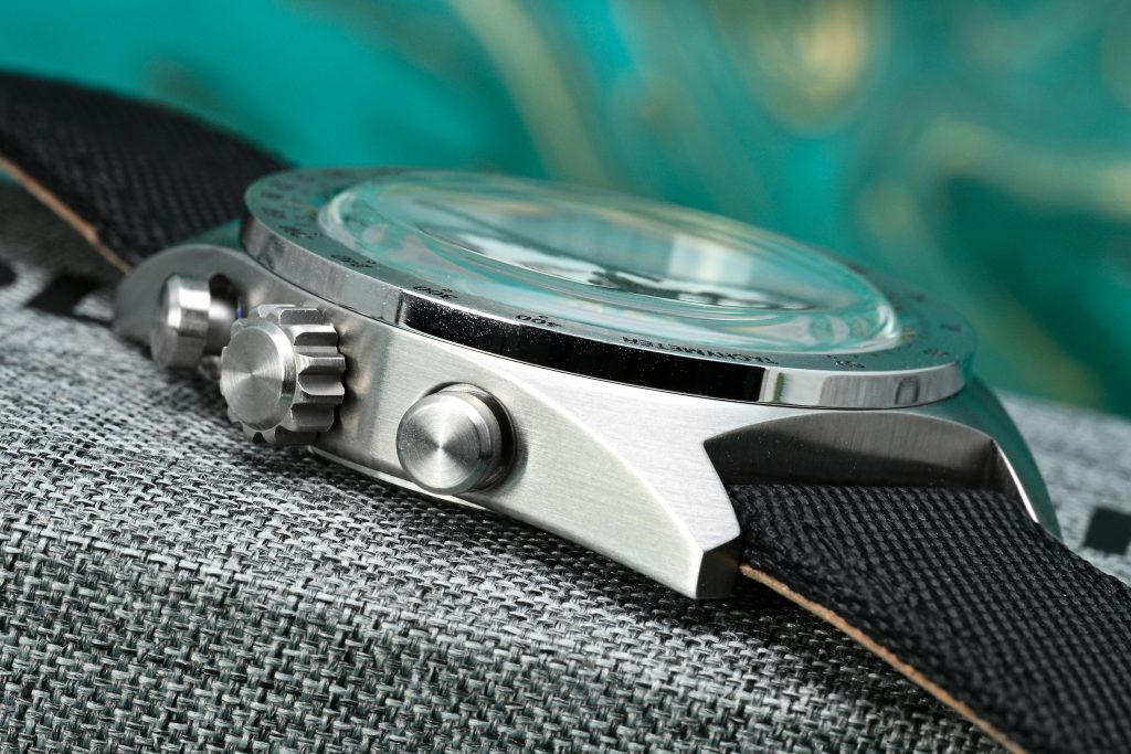 Hardware and ergonomics are well considered. You get traditional chronograph pushers flanking the crown, and the crown itself sits in the middle with excellent grip that is easy to operate. I measured the crown to be 6.4mm. The bezel is a fixed tachymeter, and importantly, it’s all steel like the rest of the case: brushed on top, with black-filled markings that keep things crisp and legible.