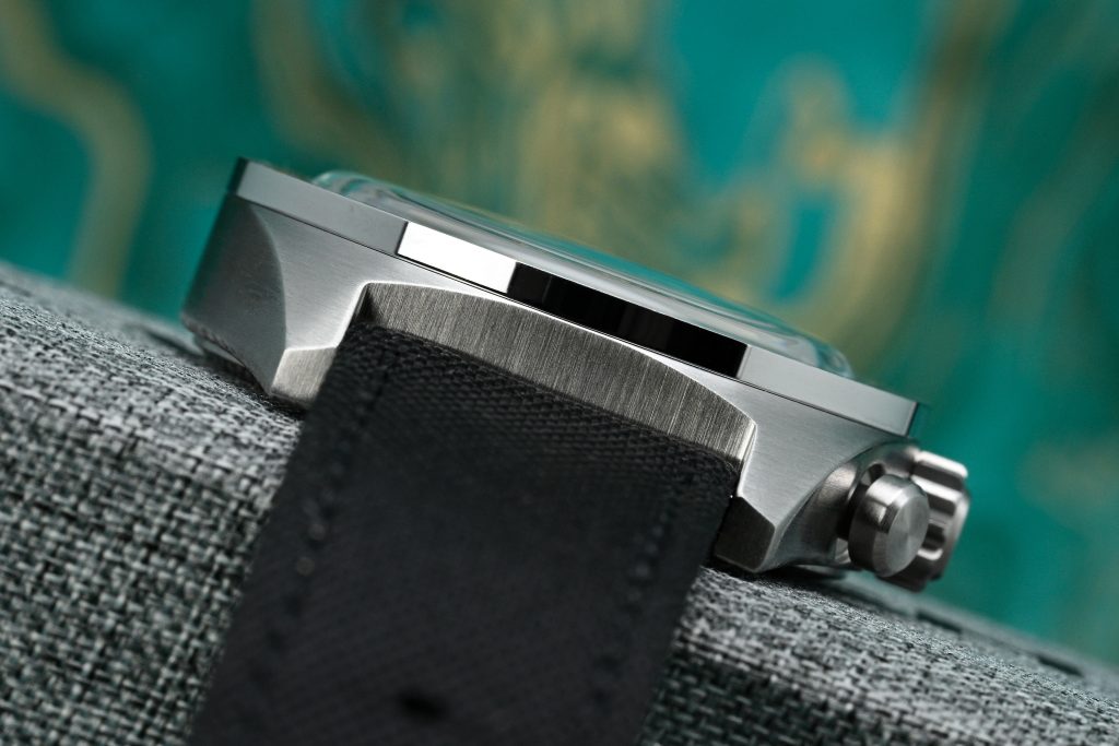 Finishing-wise, it’s exactly what you would expect it to be given the watch’s utilitarian inspiration: almost entirely brushed, with one deliberate little hit of polish: a single polished surface along the side of the bezel. It’s simple, coherent, and it makes the watch feel like it can take a few knocks without looking out of place.