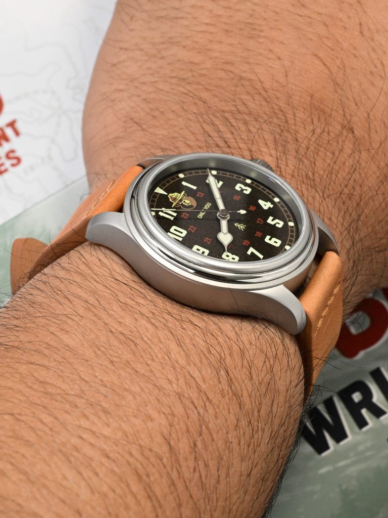 The ’44 wears well on my 6.75″ wrist, and with its 38mm diameter and 46.25mm lug-to-lug measurement, I would also feel comfortable recommending it to those with smaller wrists. The overall footprint is compact and sensible for a field watch, and it sits with the kind of balanced presence that should work across a fairly wide range of wrist sizes.
