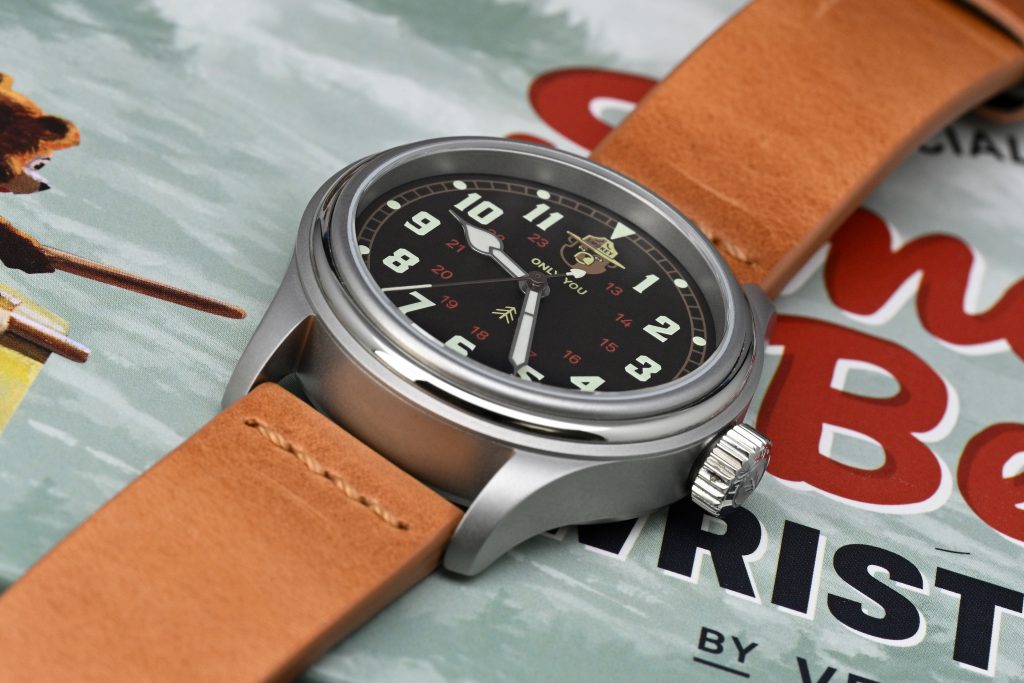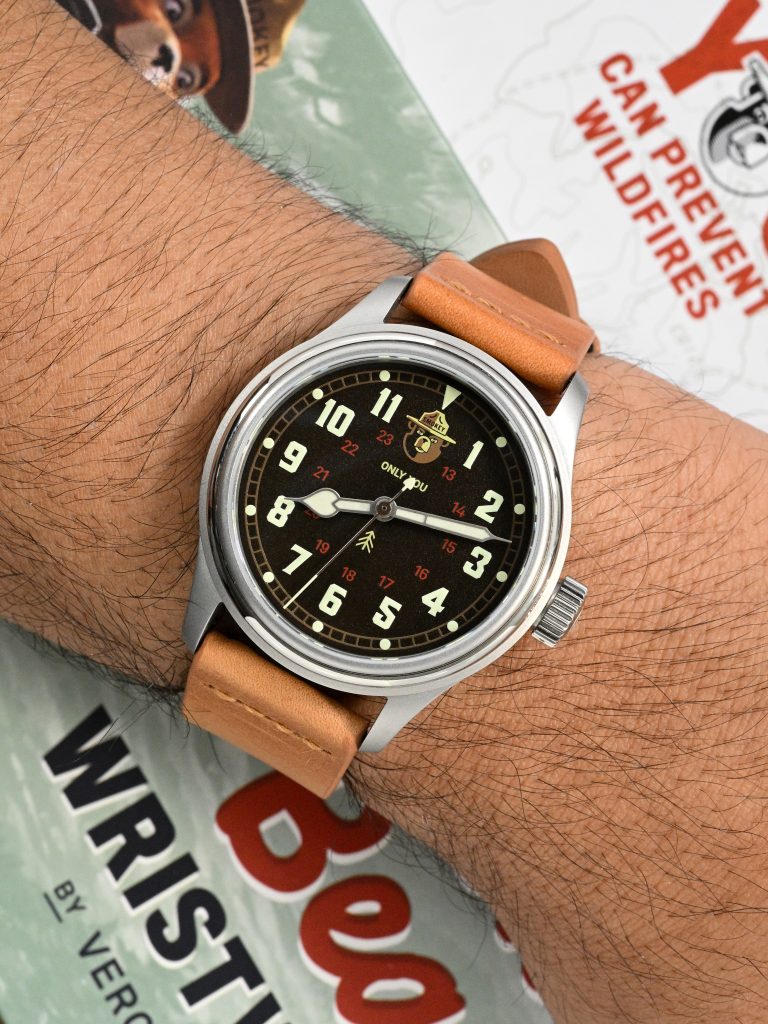 The Smokey ’44 is the more vintage-leaning execution of the concept, taking inspiration from field watches of the mid-1940s and pairing that with a dial centered around Smokey Bear himself. It is currently priced at $525, and VERO positions it alongside other Smokey Bear variants including the more modern Smokey ’64, the Campfire Edition, and the bronze-cased Smokey 80th Edition. The ’44 itself comes with both a leather strap and a canvas NATO, and on paper it sits in a very competitive part of the market where design, execution, and overall charm need to do a lot of the work. Fortunately, this is a watch that does a lot right.
