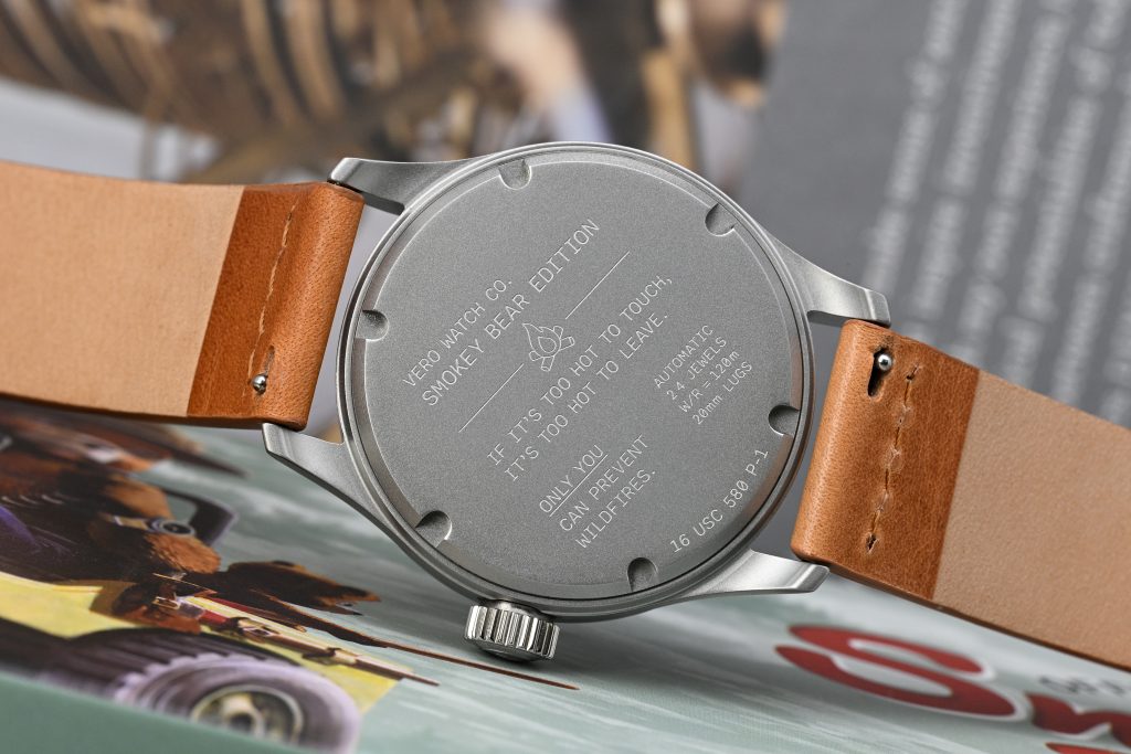 The watch being reviewed here is the Smokey ’44, an officially licensed collaboration built around one of the most recognizable public symbols in the United States. Smokey Bear first appeared in 1944 as part of the U.S. Forest Service’s wildfire prevention campaign, and he has since become an enduring symbol of wildfire prevention and stewardship of America’s forests and wildlands. VERO also states that 10% of proceeds from the Smokey Bear collection are donated to the U.S. Forest Service to support wildfire prevention education and forest conservation efforts, which gives the collaboration a more meaningful foundation than the average character-based release.
