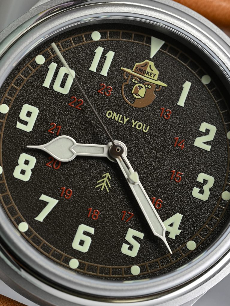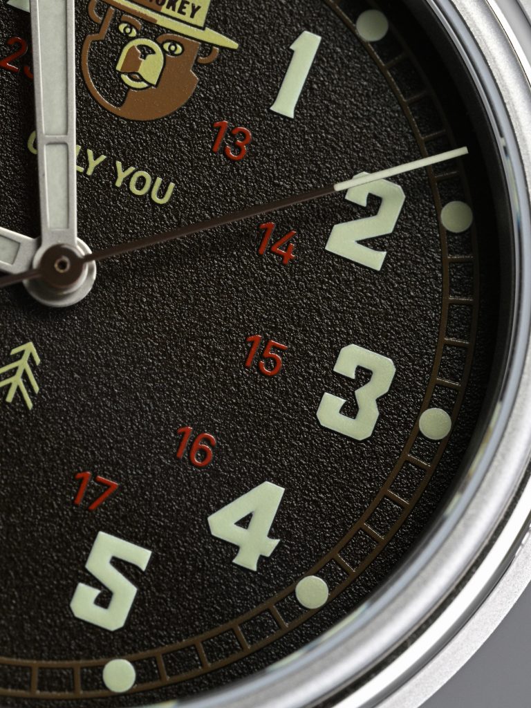 Legibility is handled very well. Around the outer edge is a brown railroad-style minute and seconds track, paired with large lumed circular pips at each hour and a small triangular marker at 12. Moving inward, Smokey Bear sits beneath 12 o’clock, acting as the thematic centerpiece of the watch. The main hour markers are large lumed Arabic numerals, while a muted red 13-24 hour ring sits further inward, reinforcing the military and field-watch character of the dial.